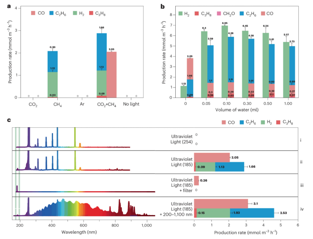 该团队报道了一种无需催化剂的转化策略,仅利用光子能量作为驱动力,即可将甲烷和二氧化碳转化为一氧化碳、氢气和乙烷。研究发现,波长为185 nm的高能光子可以引发反应,同时转化效果可利用不同能量光子(200–1100nm)的协同效应进一步增强。此外,适量引入水能显著提高反应效率,并且在模拟外太空无氧环境的实验中,实现了1.51%(24小时)的总气体转化率。