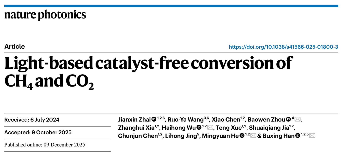 在全球迈向碳中和的进程中,甲烷与二氧化碳既是造成温室效应的“元凶”,也是潜力巨大的碳资源。因此,将两者“变废为宝”合成燃料与化学品已成为学术界与能源行业共同追逐的圣杯。然而,甲烷和二氧化碳分子十分稳定,传统转化方法需高温高压,存在能耗高、成本大及催化剂易失活等问题。光催化可在常温常压下进行,但面临光吸收弱、载流子复合快等挑战。因此,如何在温和条件下实现甲烷与二氧化碳共转化是全球能源化学领域亟待破解的核心科学问题。 鉴于此,华东师范大学化学与分子工程学院、石油化工分子转化与反应工程全国重点实验室何鸣元院士、韩布兴院士、吴海虹教授团队以及上海交通大学周宝文副教授团队在《自然•光子》期刊(Natu